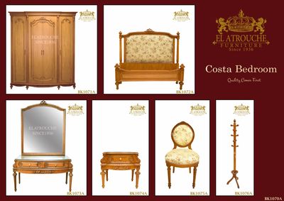 Costa Bedroom has upholstery bed; the dressing table, commode top up with glass.